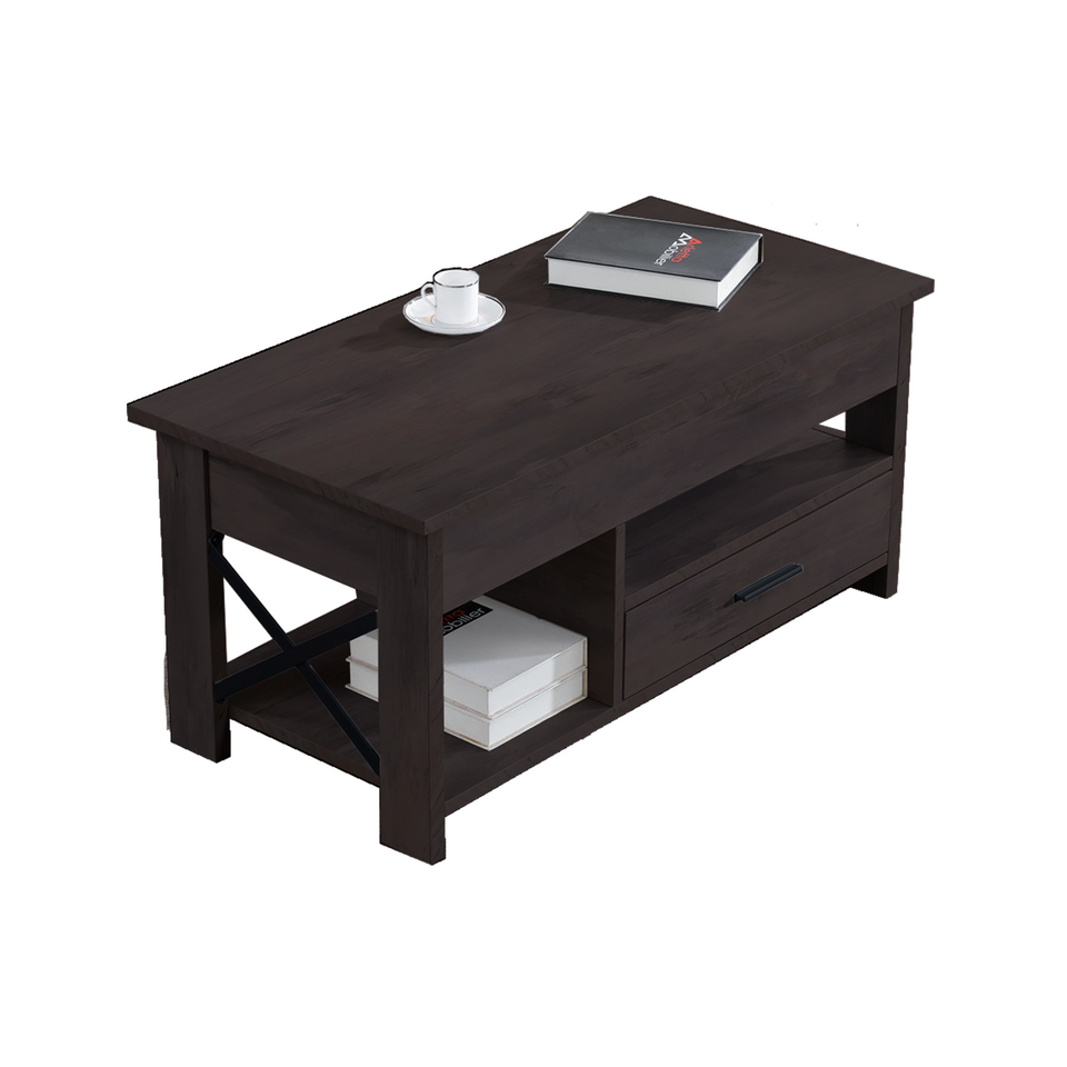 A lift top center table with storage, two open shelf, and one drawer. MATERIAL: Melamine MFC, powder coated metal COLOR: Dark Walnut SIZE: 100 x 50 x 46(59) cm
