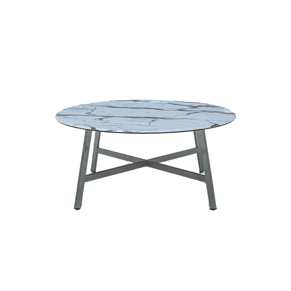 Round coffee table with Smart Top surface on brushed stainless steel legs. Heat and scratch resistant. White marble look. MATERIAL: Stainless steel, Smart Top HPL COLOR: Versilla SIZE: Dia 91.5 x H40 cm