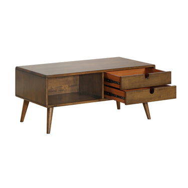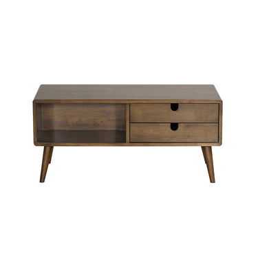 Retro scandinavian inspired series. Simple lines with rounded edges, tapered wood legs and cut out finger pulls. 2 full extension drawers. MATERIAL: Solid Rubberwood, MDF + Veneer. COLOR: Pecan SIZE: 100 x 50 x 45 cm