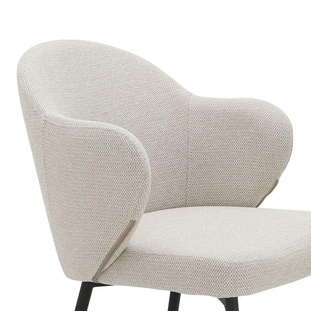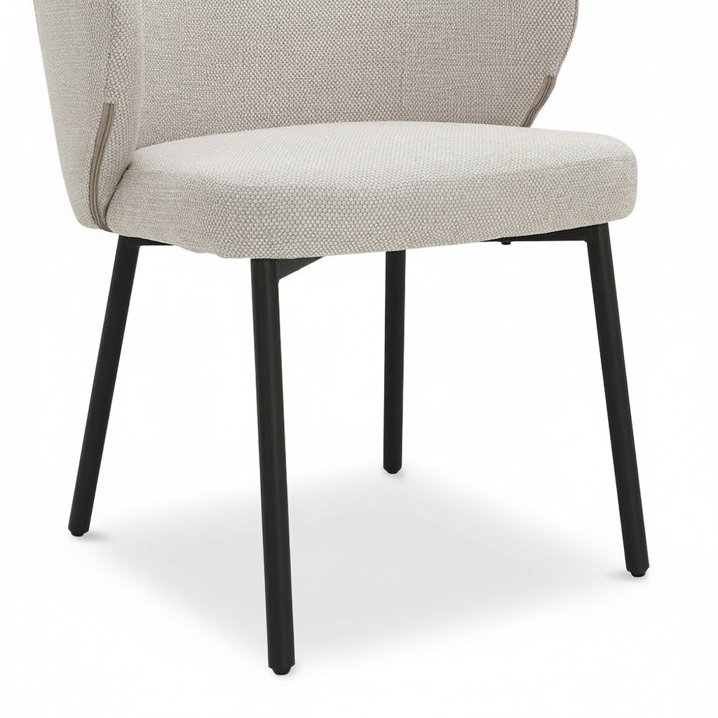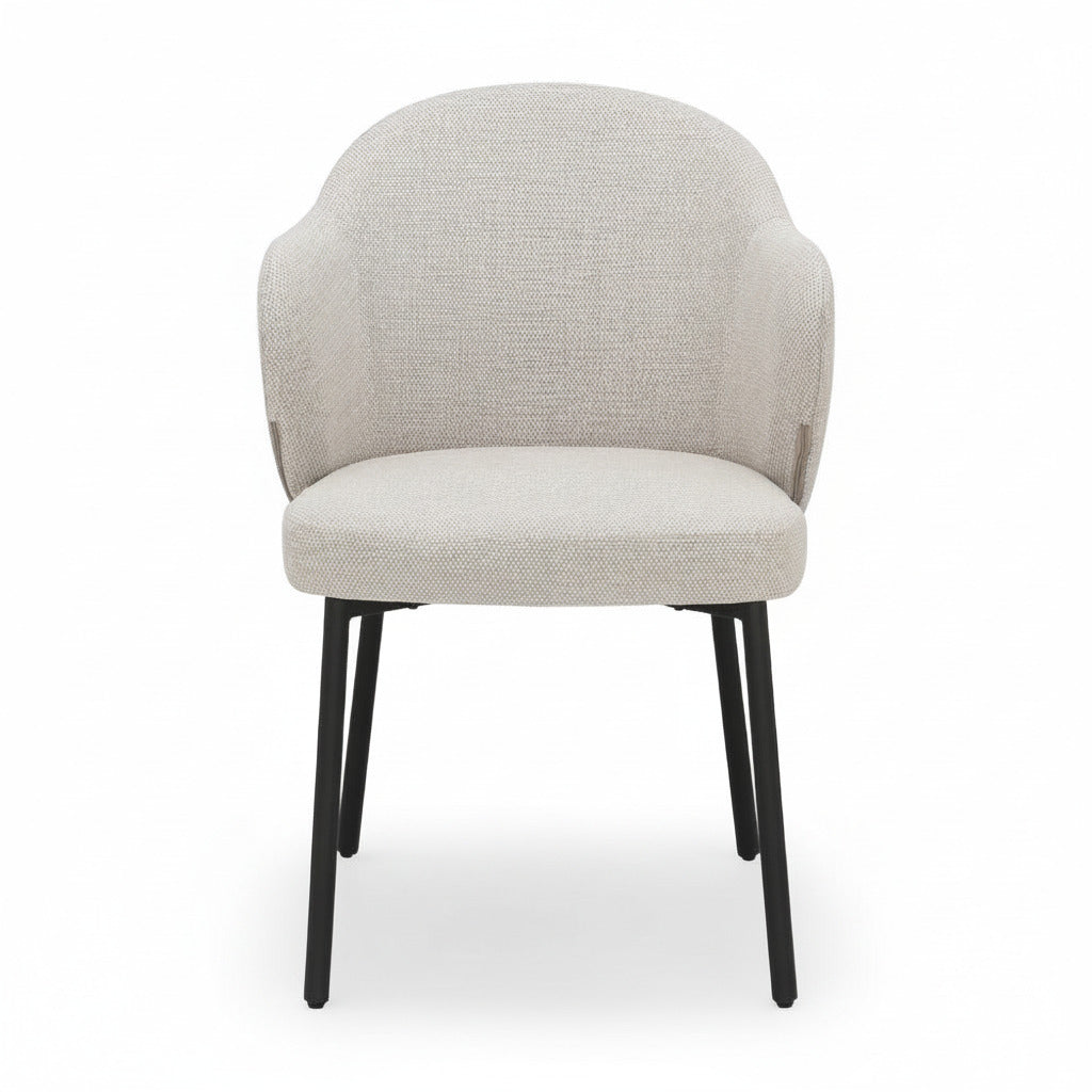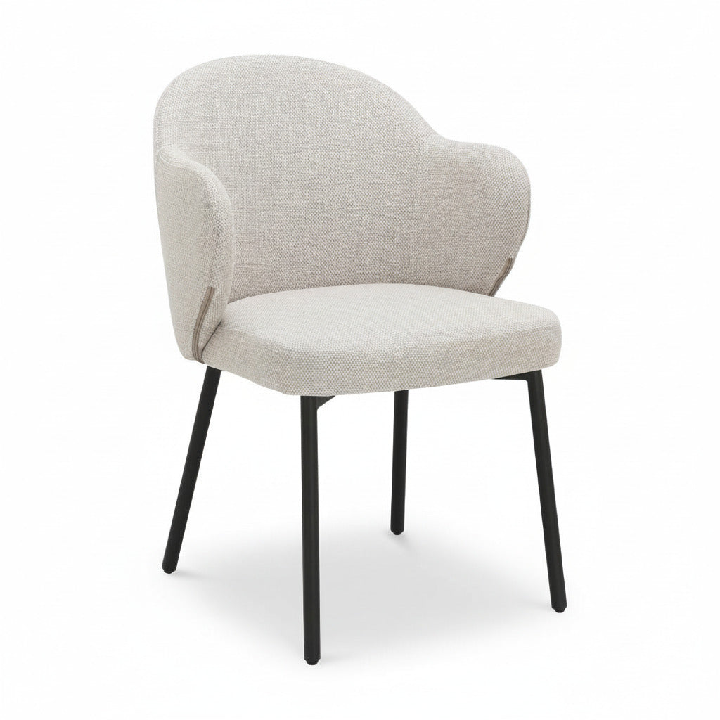 A modern fabric armchair designed with a gracefully curved back and armrest on black metal legs.