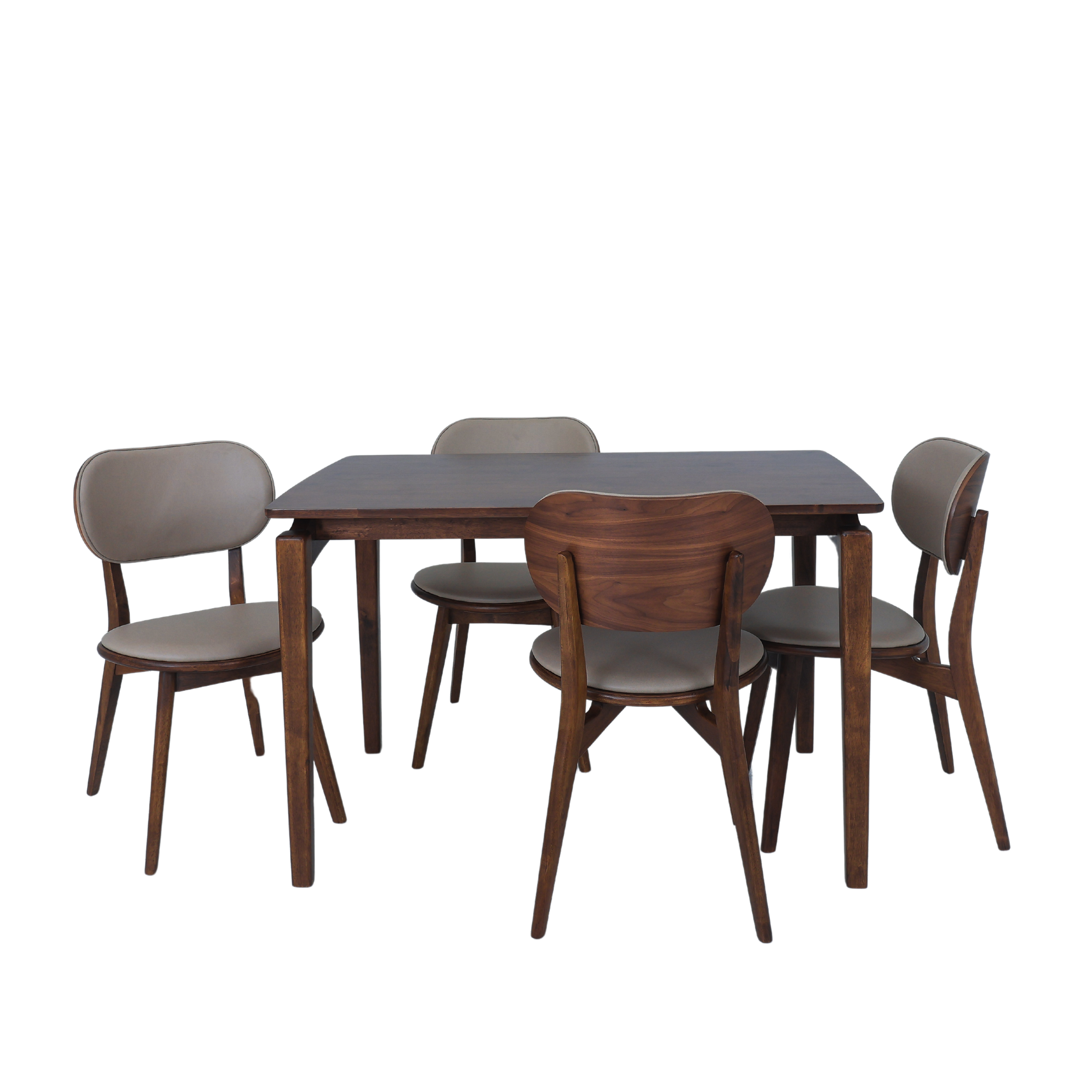 Midcentury compact solid wood dining set. Rectangular table w/soft PU seat and back cushioned chairs.
