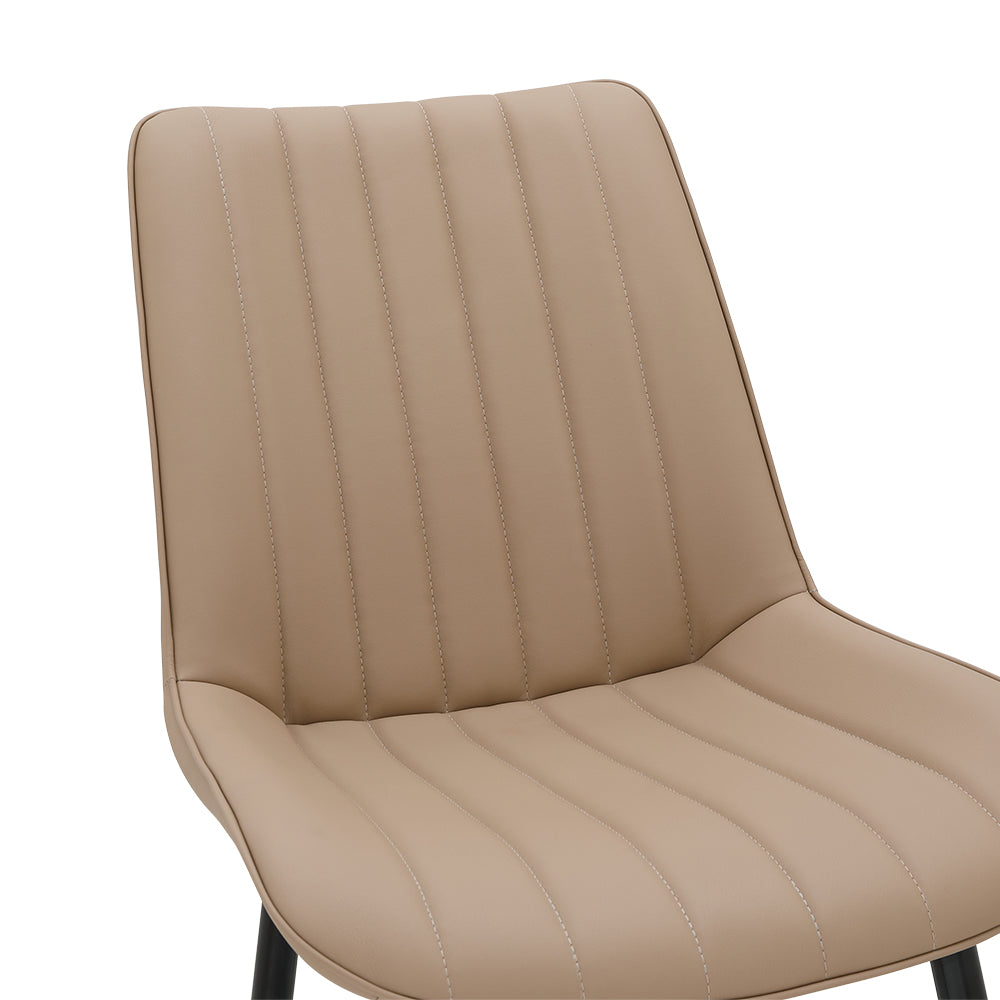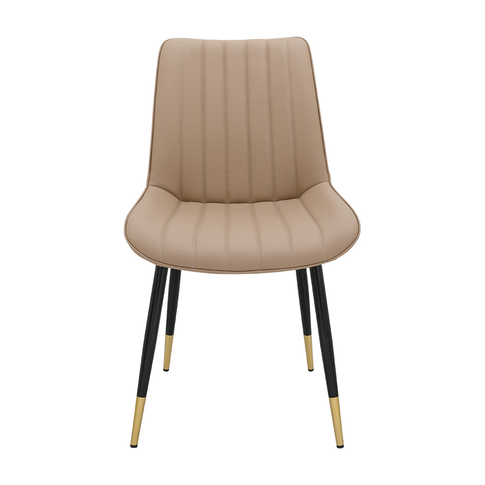 A modern dining chair upholstered in PU featuring vertical stitching lines and curved seat on a black chrome legs with gold accents.