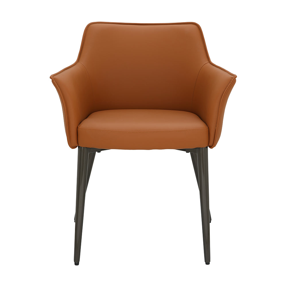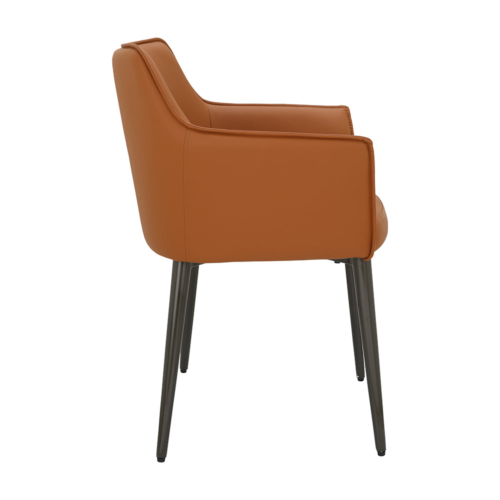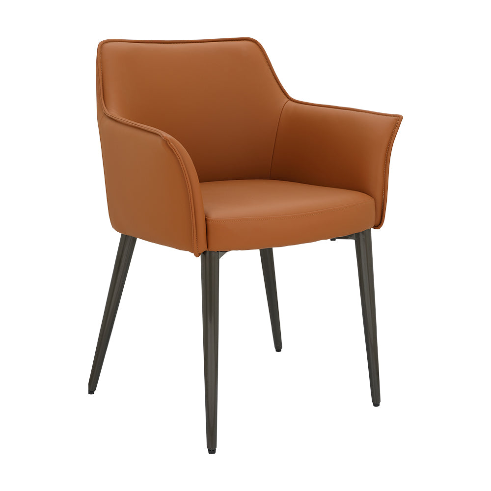 A contemporary dining chair upholstered in PU with flared armrest design on a tapered black painted steel legs.