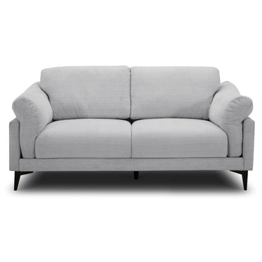 A contemporary luxe fabric sofa featuring flared cushioned armrest and comfort.