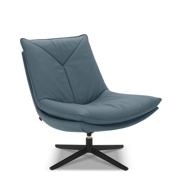 MATERIALS: Full Leather, Kiln-dried wood, Metal swivel base, feather, foam
