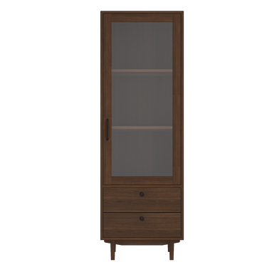 A mid-century display cabinet featuring one glass door, three shelves, two drawers with rubberwood legs.
