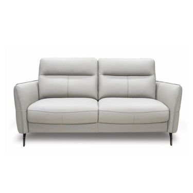 A contemporary high back half leather sofa featuring slim armrests on black chrome legs.