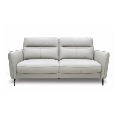 A contemporary high back half leather sofa featuring slim armrests on black chrome legs.