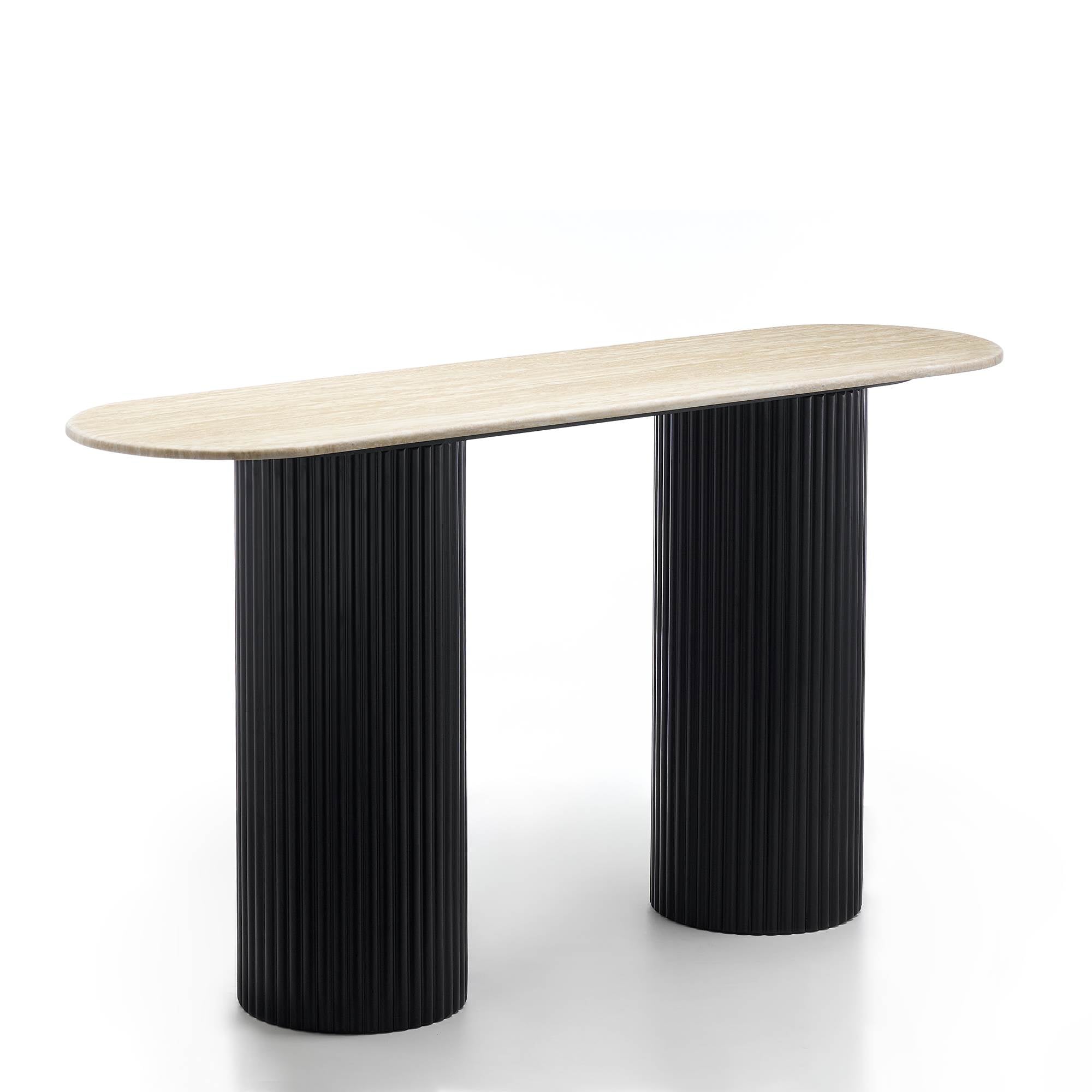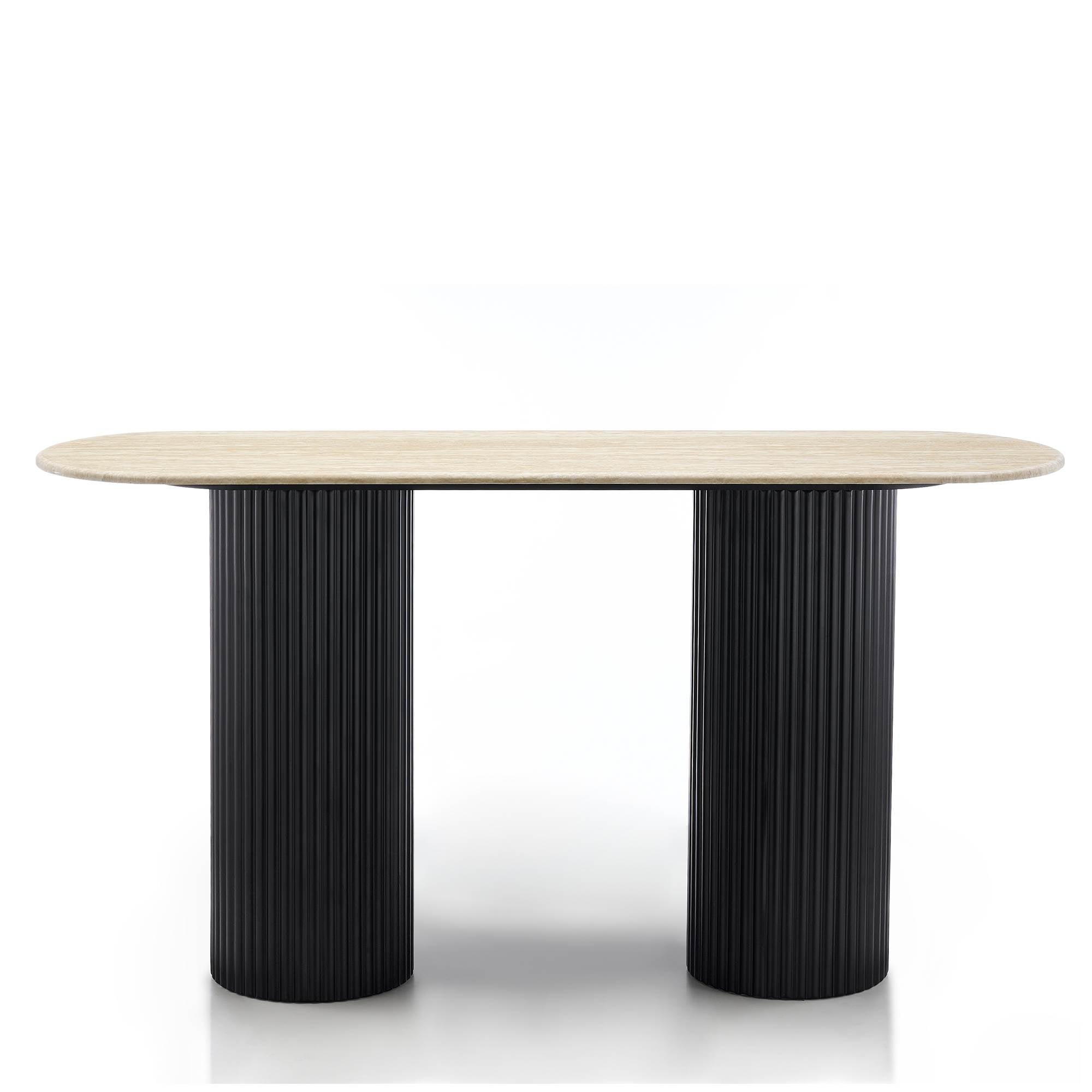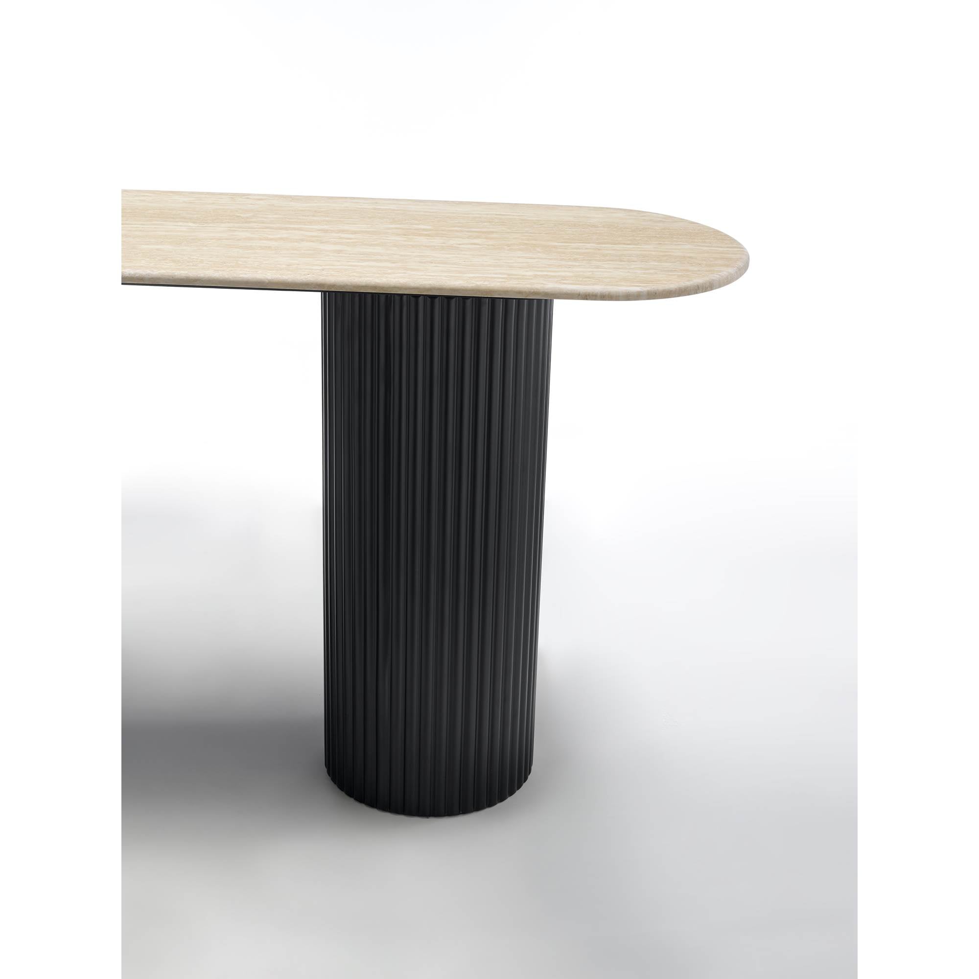 An oval-shaped resin on a stone table in travertine finish on a black fluted base. Heat and scratch resistance.
