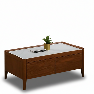 A modern luxe wooden coffee table with a white sintered top and a walnut veneer. Features an elegant beveled edge. Two drawers on slim wooden legs.