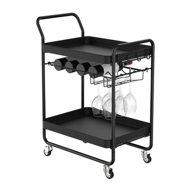 A two tier storage cart made of steel featuring wire racks and side hooks for or hanging glasses. Max load 5kg/shelf. Steel caster wheels with 2 lockable wheels.
