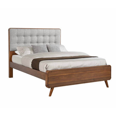 A retro mid-century inspired series, the Cypress bedroom collection features beautiful curved edges, tapered wooden legs and marquise shaped hardware. Finished in a gorgeous walnut stain. The queen bed frame comes with a fabric upholstered headboard available in an espresso or grey linen finish. Mattress size 60 x 75 inches.
