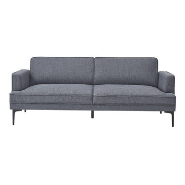 A contemporary bi-fold sofabed with piped edging on slim metal legs in black.