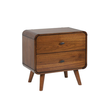A retro mid-century inspired series, the Cypress bedroom collection features beautiful curved edges, tapered wooden legs and marquise shaped hardware. Finished in a gorgeous walnut stain. Night stand with 2 full extension drawers. Top drawer lined in velvet.