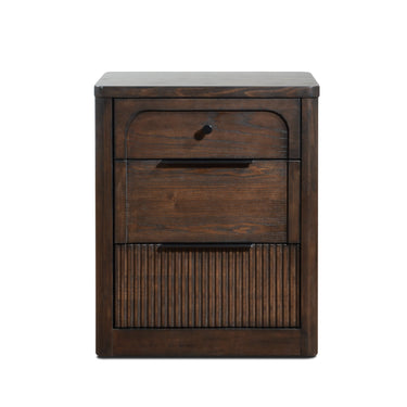 A Mid-century modern series featuring fluted design on curved body. This night stand features three full extension Drawers with black metal handles.