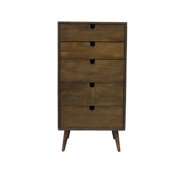 Inspired by retro scandi style. It features simple lines with rounded edges, tapered solid wood legs and cut out finger pulls. With 5 drawers.