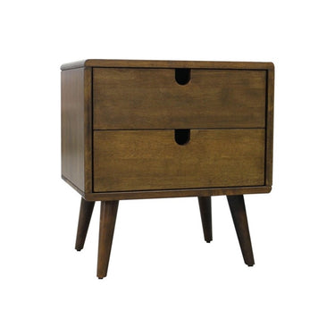 Inspired by Retro Scandinavian style, it features simple lines with rounded edges, tapered solid legs and cut out finger pulls with 2 drawers.