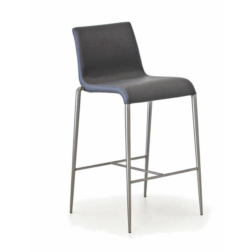 Modern bar stool upholstered in CPU on brushed stainless steel legs.