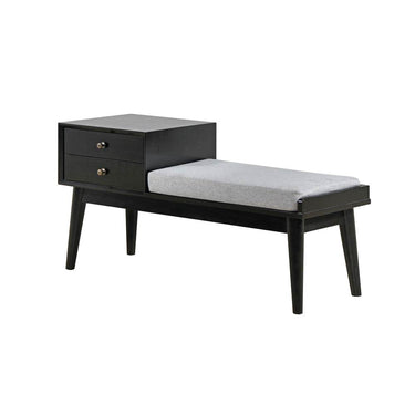 Storage Bench, Simple yet sophisticated mid- century inspired series with slim tapered legs & angles face. 2 full extension drawers, padded seat, brass handle.