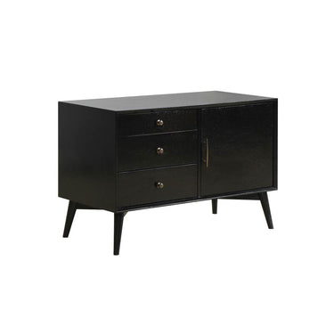 Simple yet sophisticated mid-century inspired series with slim tapered legs & angled face. 1 door 3 full ext drawers. Brass handle.