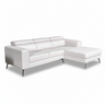 A contemporary compact fabric sectional sofa with adjustable headrest on black metal legs. Right side chaise.