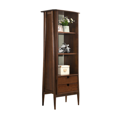 Tall narrow cabinet with 2 adjustable shelves and 2 full extension drawers. Integrated handles, vent cut-outs and ply drawers.