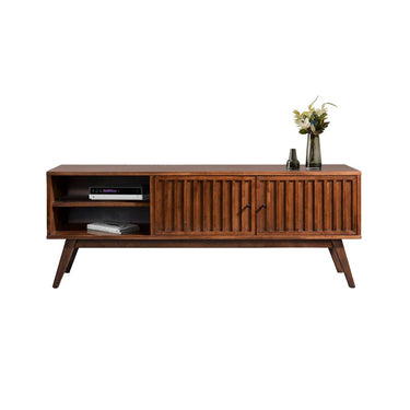 A two door TV cabinet in slatted design with adjustable shelves. Metal handle and ventilation cutout.