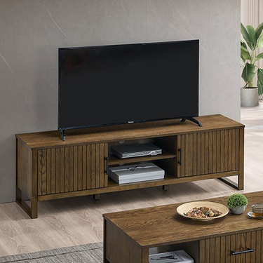 A Contemporary Tv cabinet featuring fluted design. Two door soft close cabinet and two open compartment in solid rubberwood frame.