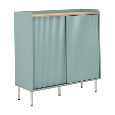 A modern low cabinet featuring two fluted design sliding doors and adjustable shelves with gold finish steel legs. Wall mounting recommended.