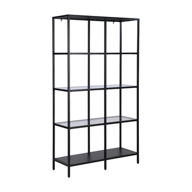 A four tier shelving unit with combination of tempered glass and steel shelf in black powder coating metal frame.