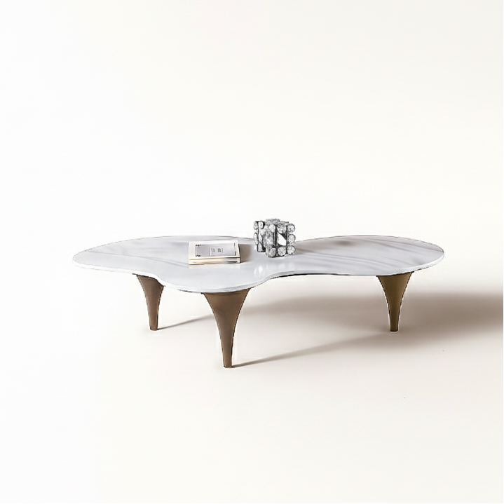 A modern center table featuring unique wave shape design top made of sintered stone on tapered carbon steel base in wood finish.