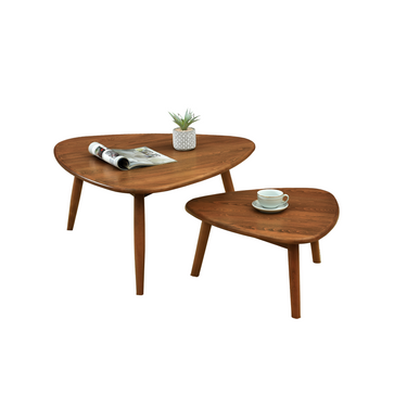 A contemporary nest of tables featuring triangular table top with softly rounded edge on a tapered wooden legs.