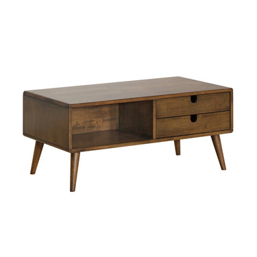 Retro scandinavian inspired series. Simple lines with rounded edges, tapered wood legs and cut out finger pulls. 2 full extension drawers.