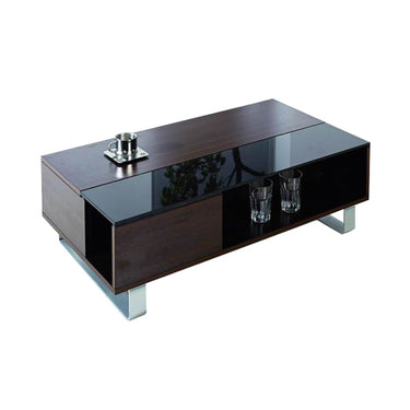 A functional center table with concealed storage. A gentle lift of the table top transforms it into a working table. Contrasting wood and glass finish give it a modern vibe.