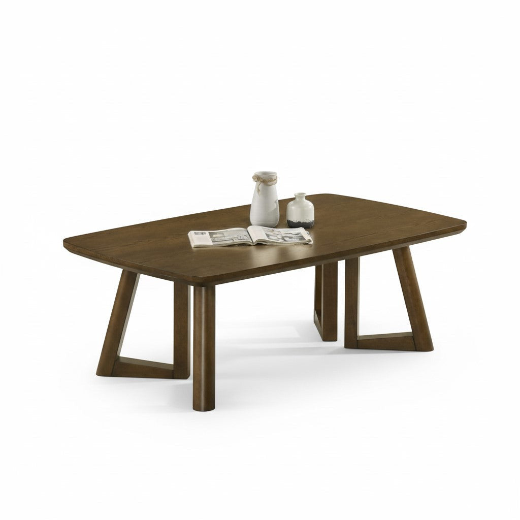A contemporary coffee table with geometric design legs.