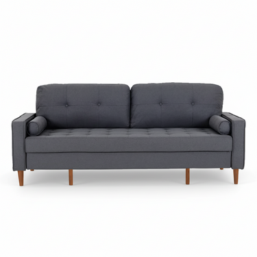 Mid-century sofa-bed with tufted seat and back. Piped edging tapered wood legs in walnut finish with storage compartment and two bolster pillows.