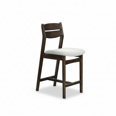 A contemporary wooden barstool with a fabric seat cushion. Seat height 24 inches.