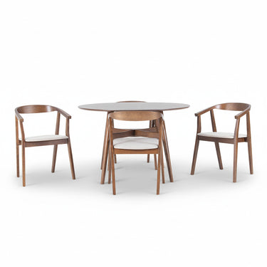 A round dining table and smooth curved back dining chairs with upholstered seats.