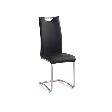 Modern PU upholstered dining chair with top handle on a brushed stainless steel sled base.