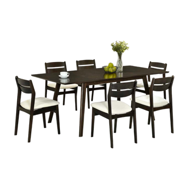 A rectangular dining set featuring a butterfly extending dining table and solid wood chairs with fabric cushions.