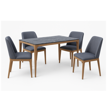 A modern rectangular dining set featuring a Smart Top table with shock and scratch resistant on solid rubberwood legs. Fabric upholstered dining chair diamond at the backrest. Water repellent fabric.
