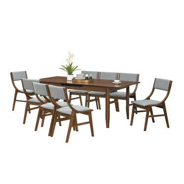 A mid-century modern inspired dining set with a rectangular extending dining table and unique curved back design chairs upholstered in fabric.
