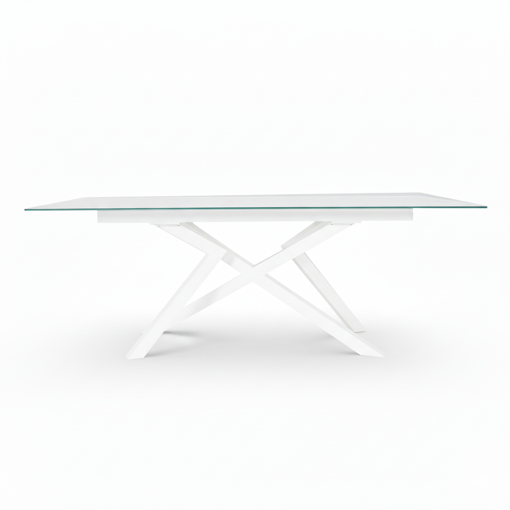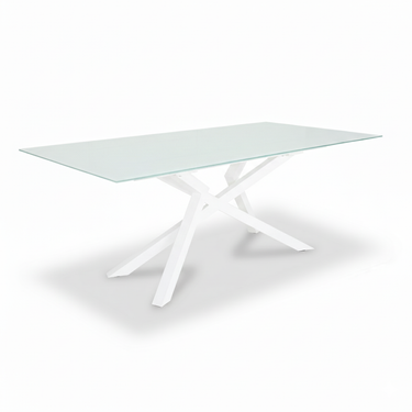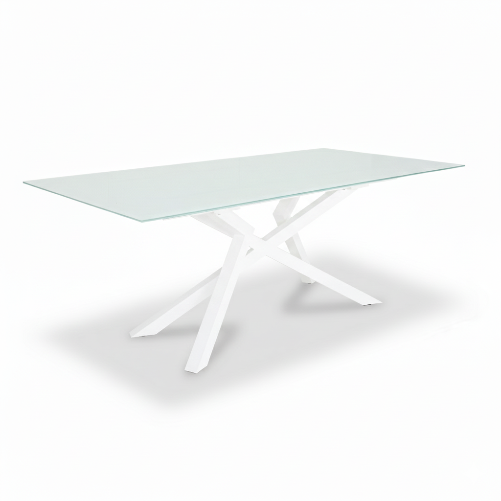 Modern cross base dining table with 10mm pure white tempered glass top and white painted steel base.