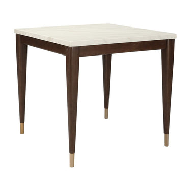 Luxe marble top dining table with gold capped solid rubberwood base.