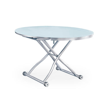 The epitome of functionality. This multi-purpose piece is height adjustable from center table to dining table. Plus extendable sides transform it into a large round table. Comfortably seats 2-4 people.