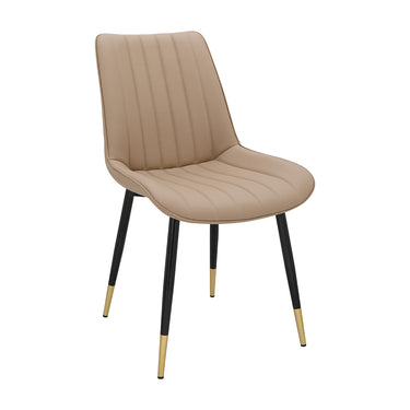 A modern dining chair upholstered in PU featuring vertical stitching lines and curved seat on a black chrome legs with gold accents.