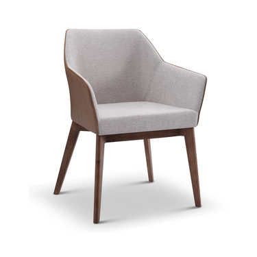 A two-toned PVC + fabric upholstered captain chair with solid ash wood legs in a walnut finish. Use it as an accent chair or a dining chair.