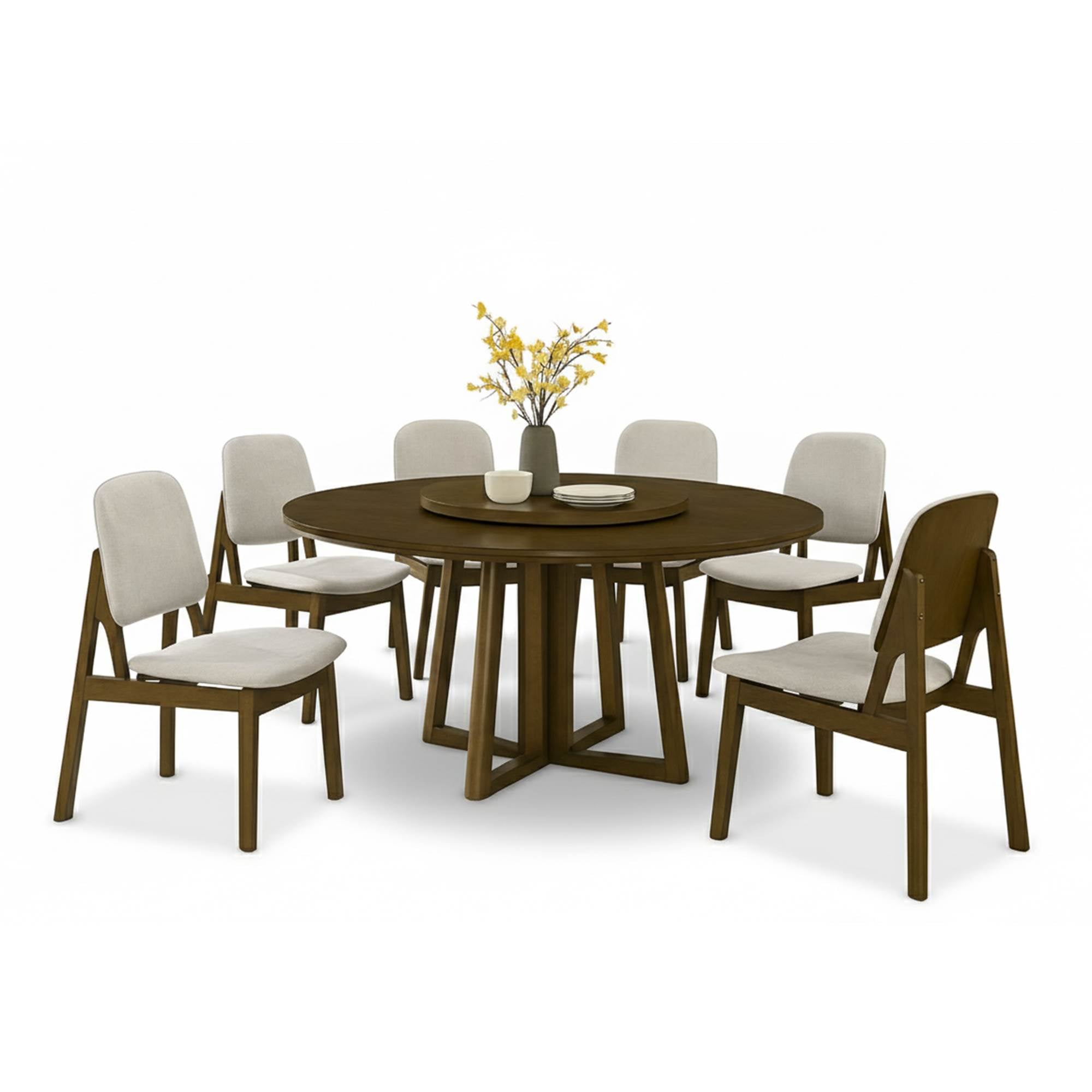 A contemporary dining set featuring round dining table with lazy susan on a geometric wooden base. Six fabric upholstered dining chairs.