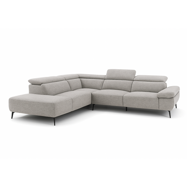 A contemporary European fabric corner sofa featuring adjustable headrests on sleek black metal legs. Left side Chaise.