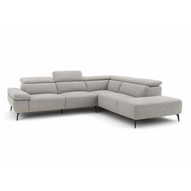 A contemporary European fabric corner sofa featuring adjustable headrests on sleek black metal legs. Right side Chaise.